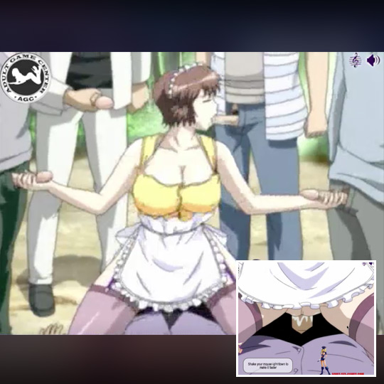 In this interactive scene you wake one fine morning in your mansion to her strange sex noises coming from the edge of your property. You go to explore and find your maid is having group sex with a bunch of business men. He big tits bounce and flop out. She’s got a cock in her pussy as she rides cowgirl and a cock in each hand giving handjobs and blowjobs to these lucky fellow. Use your mouse to help along the scene and make her cum by filling her love meter. She moans and so do they. Gang bangs are awesome.